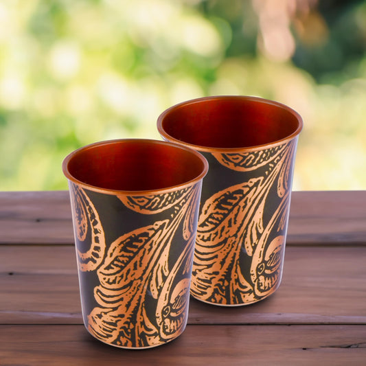Exotic Elements Mīnākārī Art Designer Copper Tumblers | Set of 2, 300ML each | Immunity Booster, Protects Liver (Leafy Teal)
