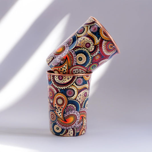 Exotic Elements Mīnākārī Art Designer Copper Tumblers | Immunity Booster, Protects Liver | Set of 2, 300ML each (Paisley Cream)